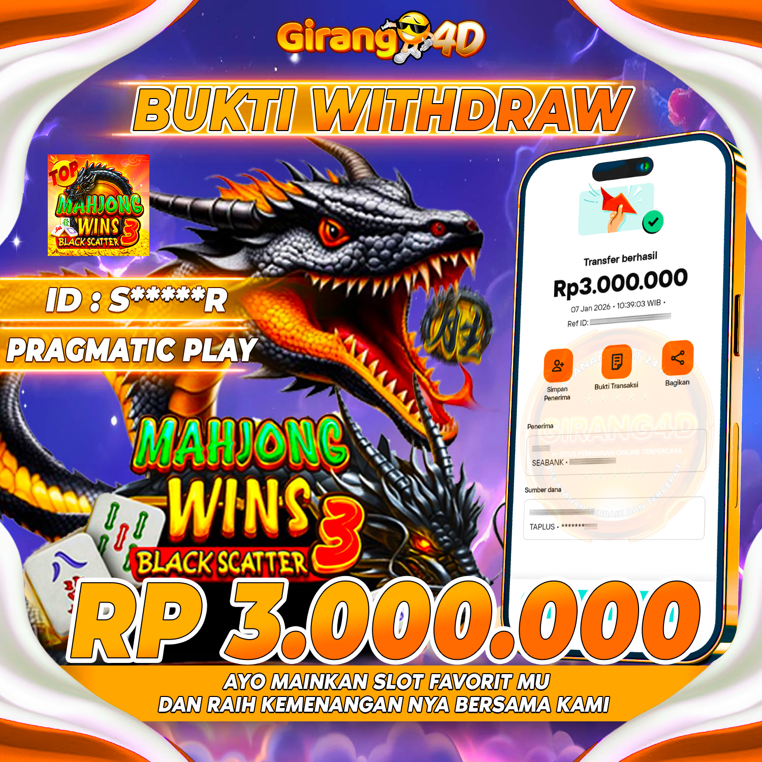 Selamat Kepada Id : S*****R Atas Withdraw Rp. 3.000.000 Juta Hari ini. Ditunggu Withdraw Selanjutnya dan ajak juga teman temannya bergabung di GIRANG4D