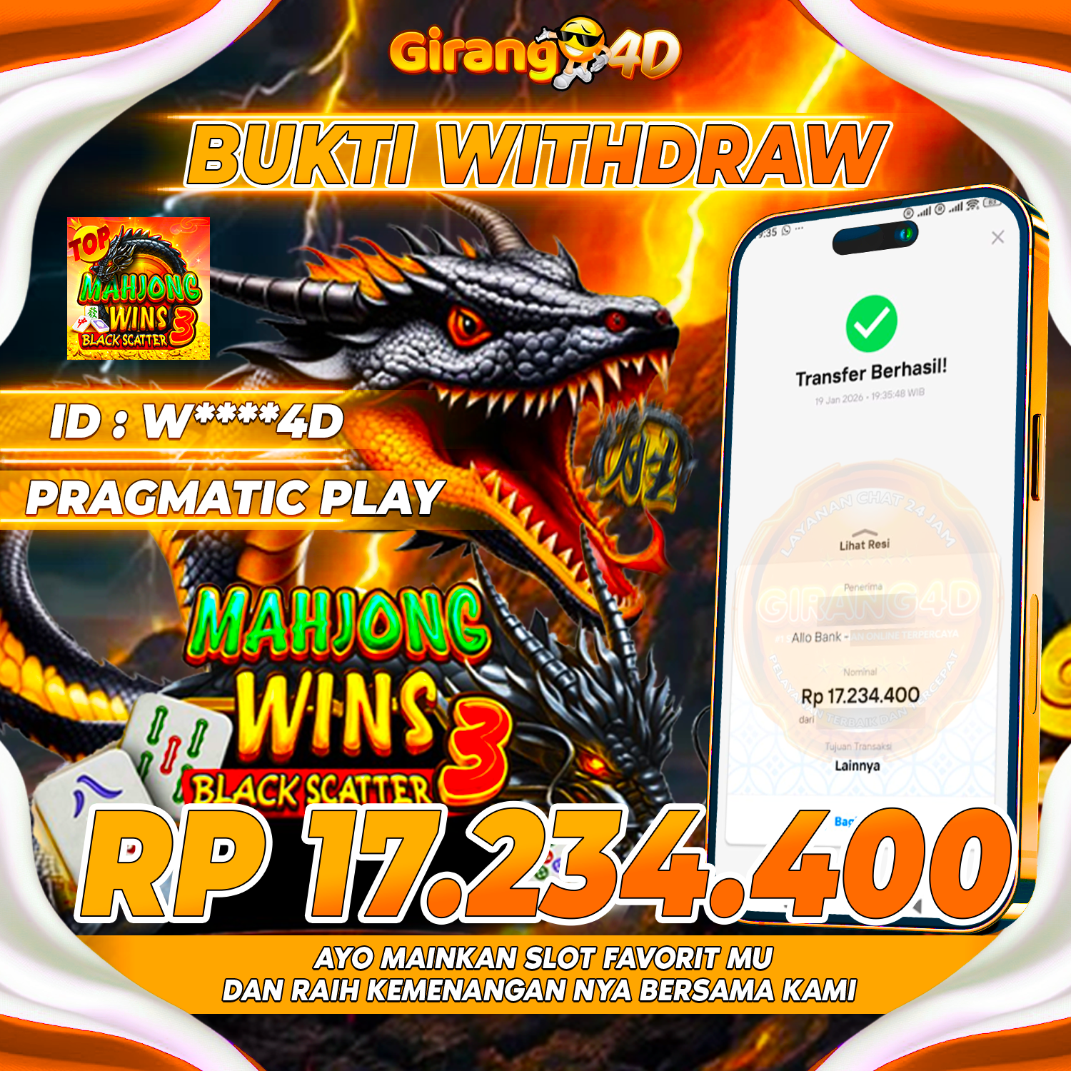 Selamat Kepada Id : W****D Atas Withdraw Rp. 17.234.400 Hari ini. Ditunggu Withdraw Selanjutnya dan ajak juga teman temannya bergabung di GIRANG4D