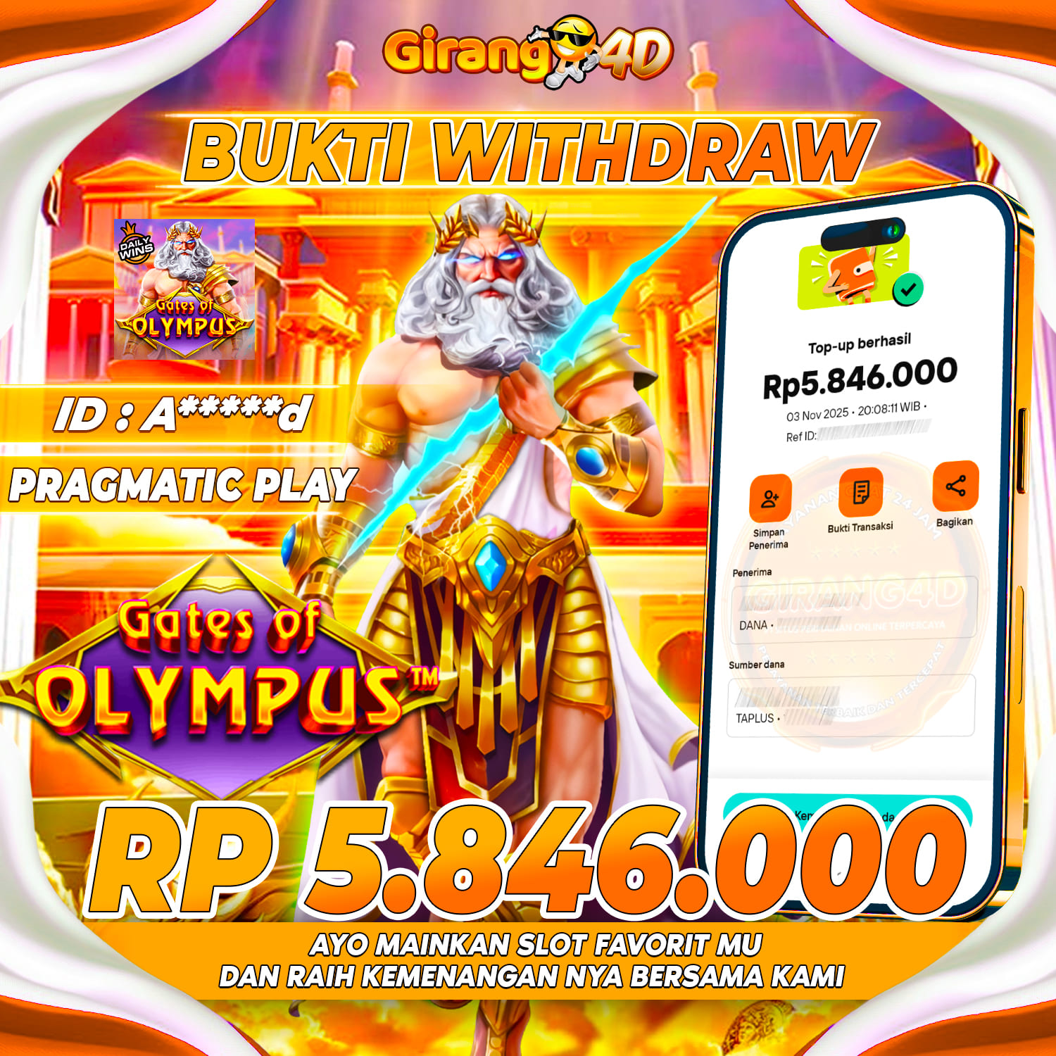 Selamat Kepada Id : A******d Atas Withdraw Rp. 5.846.000 Juta Hari ini. Ditunggu Withdraw Selanjutnya dan ajak juga teman temannya bergabung di GIRANG4D