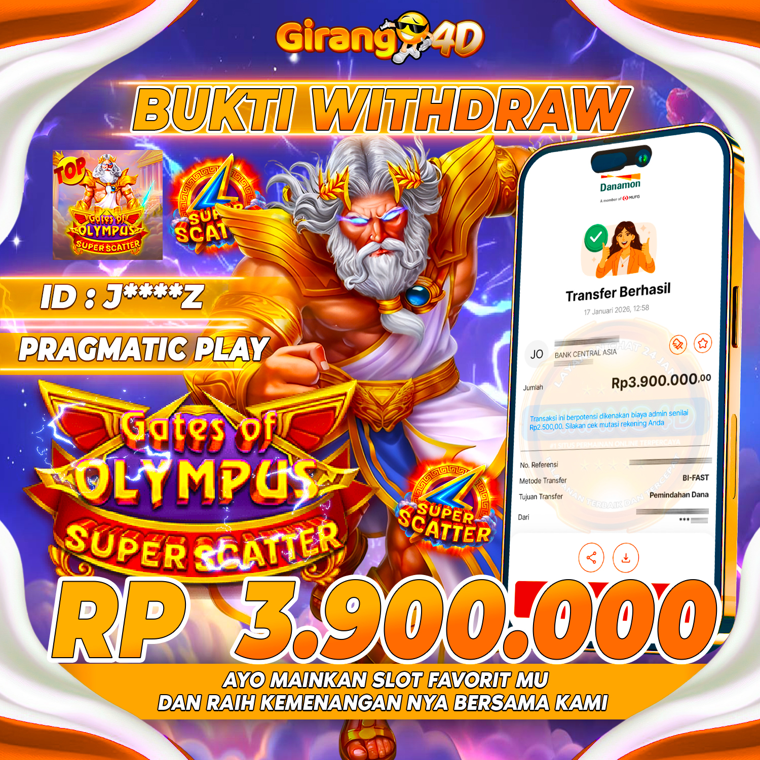 Selamat Kepada Id : J*****Z Atas Withdraw Rp. 3.900.000 Hari ini. Ditunggu Withdraw Selanjutnya dan ajak juga teman temannya bergabung di GIRANG4D