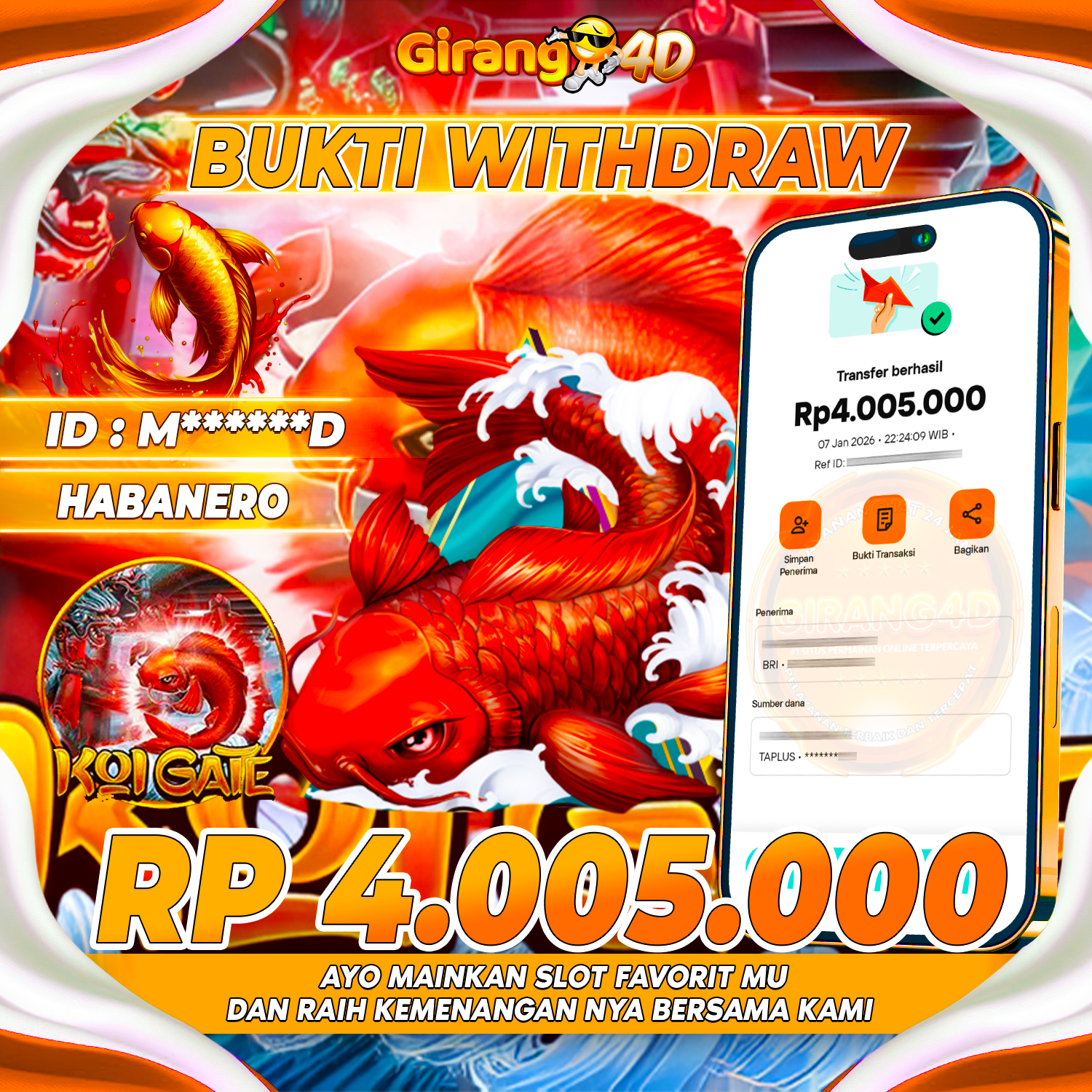 Selamat Kepada Id : M*******D Atas Withdraw Rp. 4.005.000 Juta Hari ini. Ditunggu Withdraw Selanjutnya dan ajak juga teman temannya bergabung di GIRANG4D