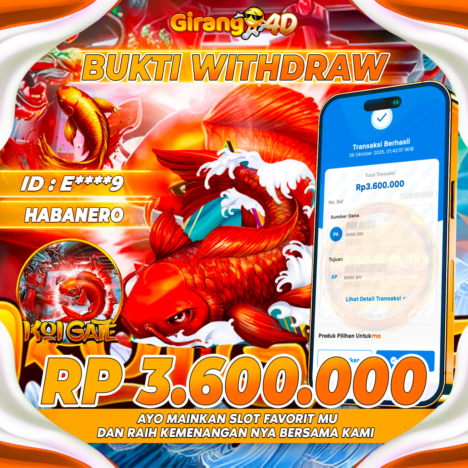 Selamat Kepada Id : E****9 Atas Withdraw Rp. 3.600.000 Juta Hari ini. Ditunggu Withdraw Selanjutnya dan ajak juga teman temannya bergabung di GIRANG4D