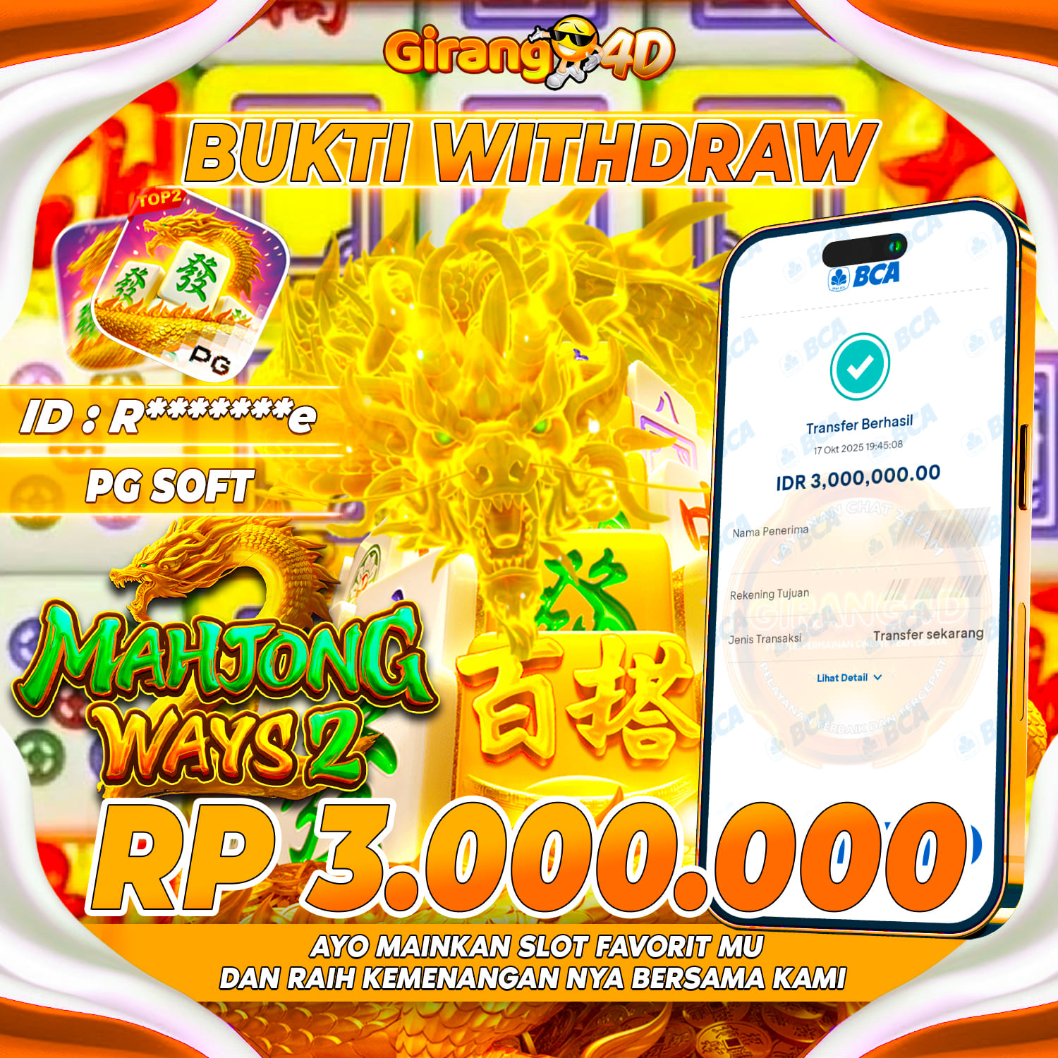Selamat Kepada Id : R******e Atas Withdraw Rp. 3.000.000 Juta Hari ini. Ditunggu Withdraw Selanjutnya dan ajak juga teman temannya bergabung di GIRANG4D