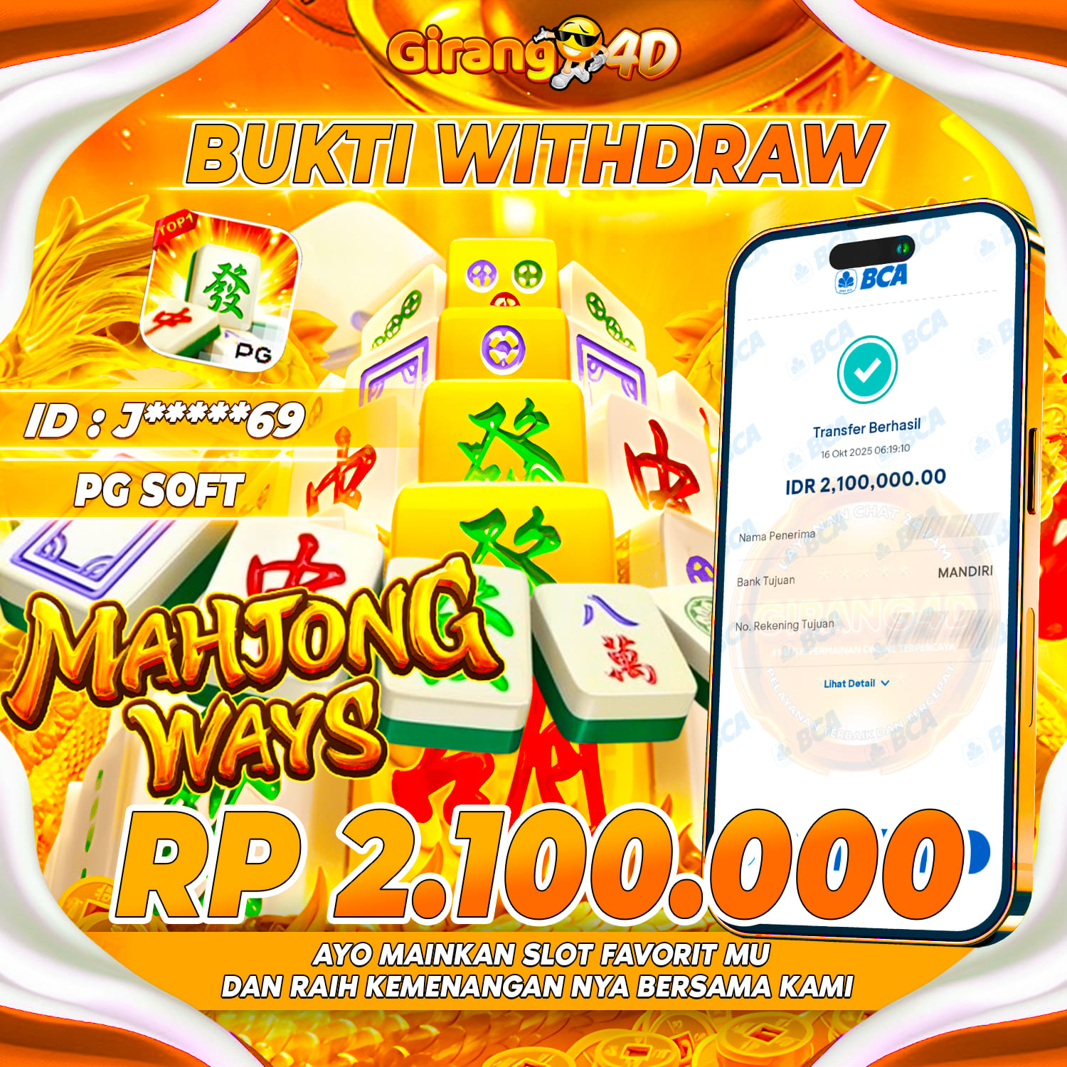 Selamat Kepada Id : J*****69 Atas Withdraw Rp. 2.100.000 Juta Hari ini. Ditunggu Withdraw Selanjutnya dan ajak juga teman temannya bergabung di GIRANG4D