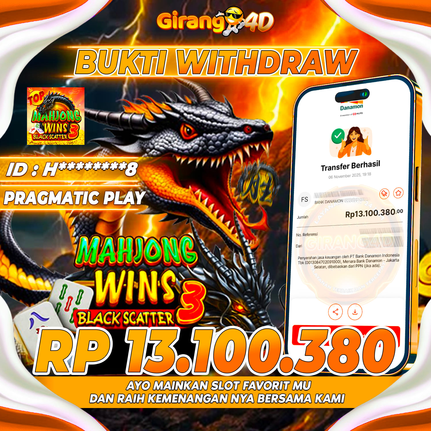 Selamat Kepada Id : H********8 Atas Withdraw Rp. 13.100.380 Juta Hari ini. Ditunggu Withdraw Selanjutnya dan ajak juga teman temannya bergabung di GIRANG4D
