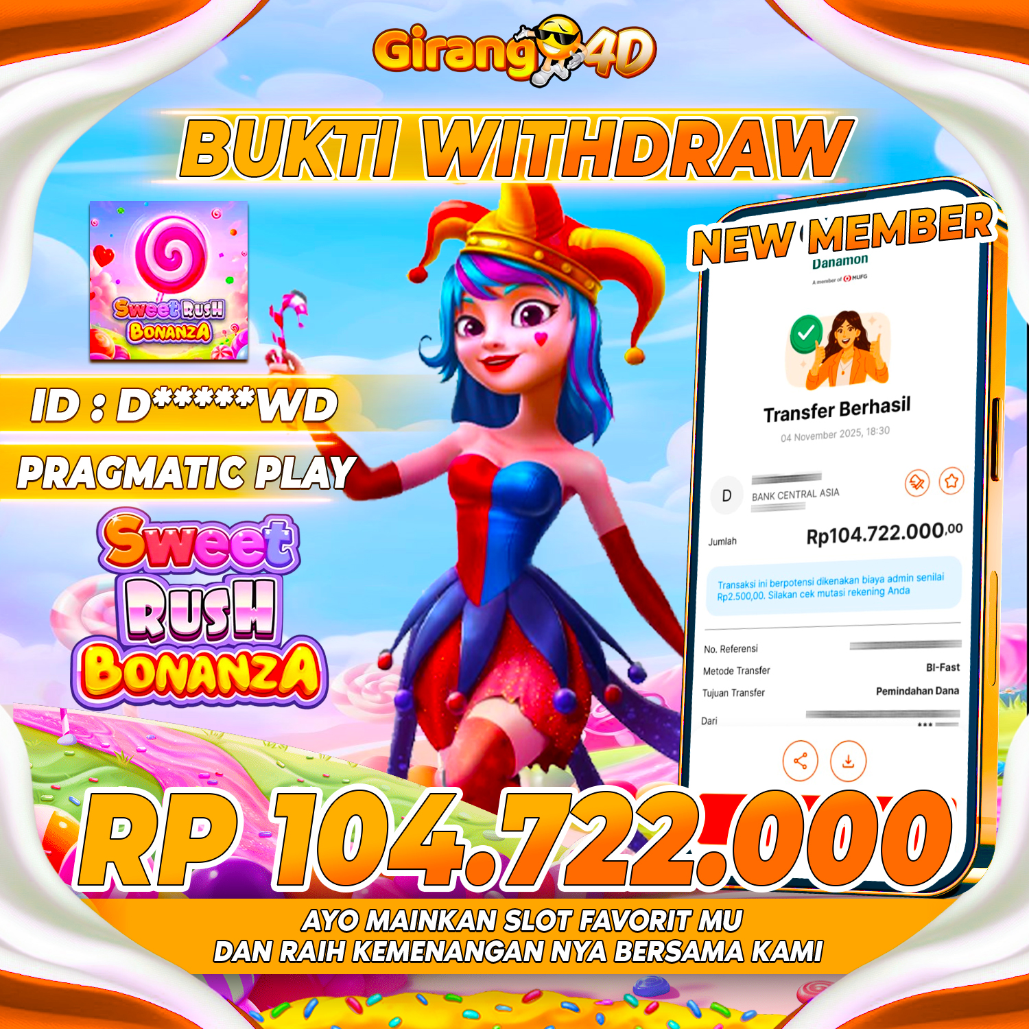 Selamat Kepada Id : D*****WD Atas Withdraw Rp. 104.722.000 Juta Hari ini. Ditunggu Withdraw Selanjutnya dan ajak juga teman temannya bergabung di GIRANG4D
