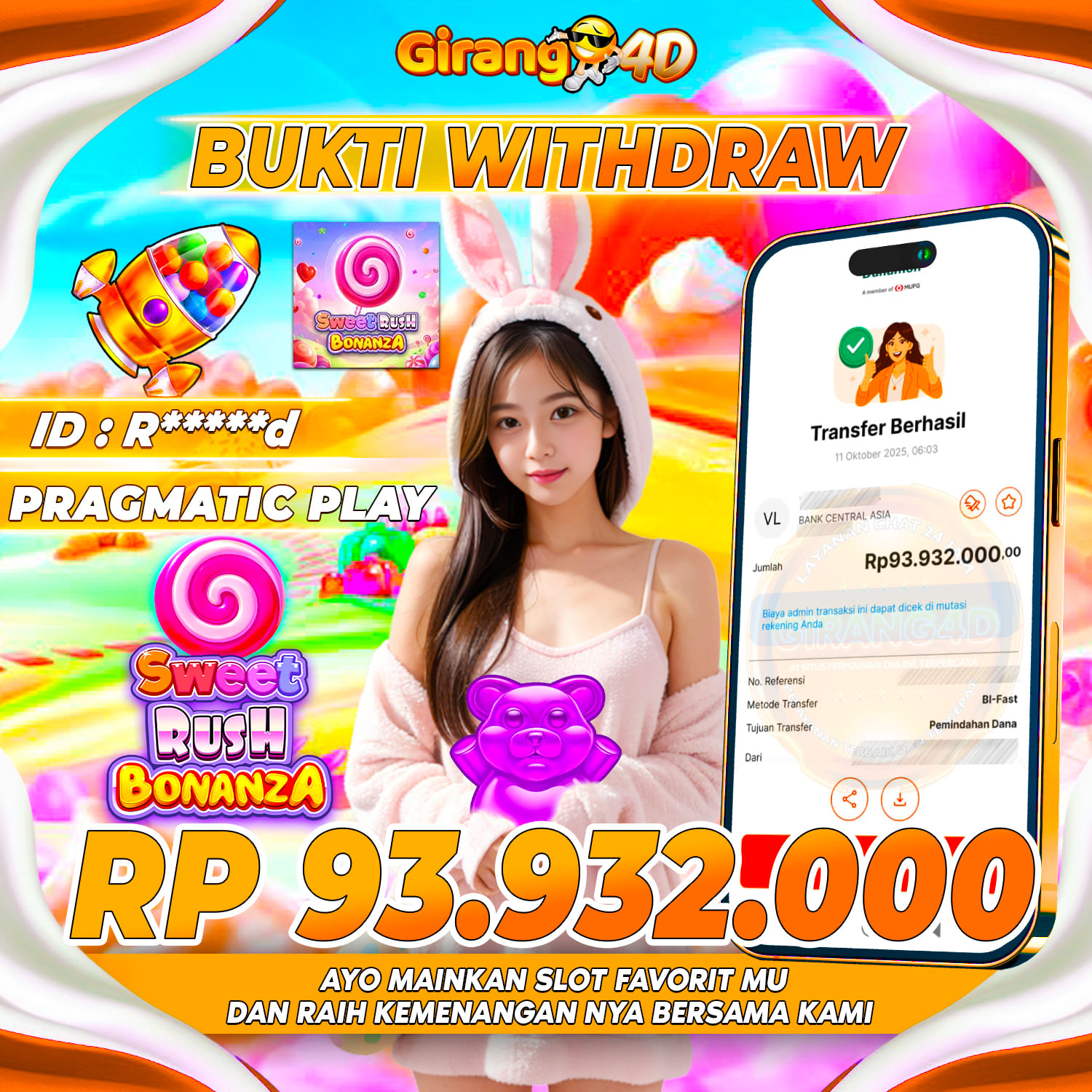 Selamat Kepada Id : R*****d Atas Withdraw Rp. 93.932.000 Juta Hari ini. Ditunggu Withdraw Selanjutnya dan ajak juga teman temannya bergabung di GIRANG4D
