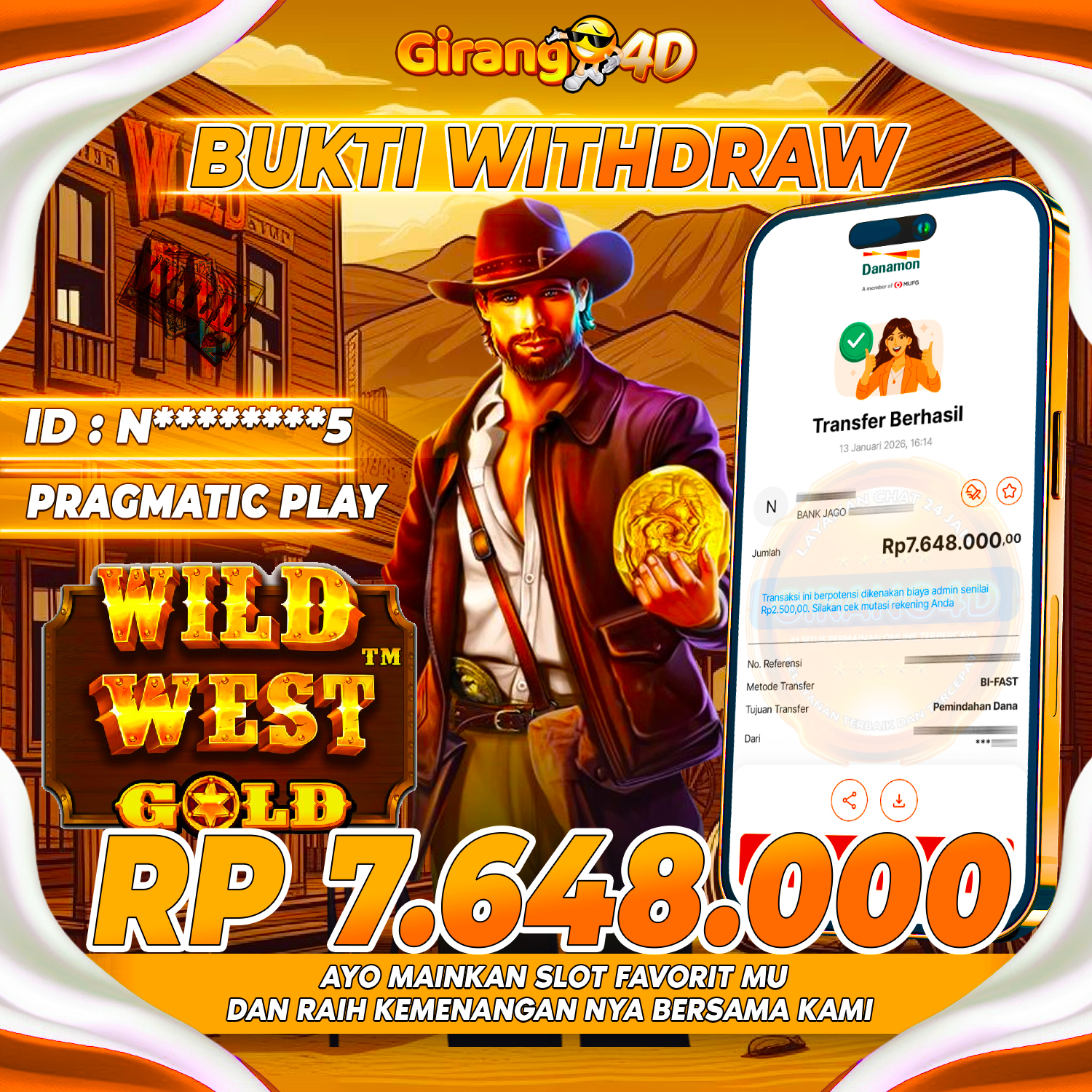 Selamat Kepada Id : N*****5 Atas Withdraw Rp. 7.648.000 Hari ini. Ditunggu Withdraw Selanjutnya dan ajak juga teman temannya bergabung di GIRANG4D